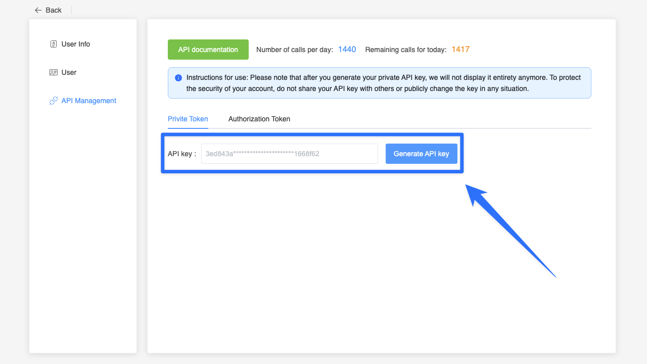 A: API-nøglen bliver automatisk skjult, når du forlader siden. Du kan oprette en ny nøgle ved at klikke ‘Generate API Key’. Den gamle nøgle bliver ugyldig herefter.