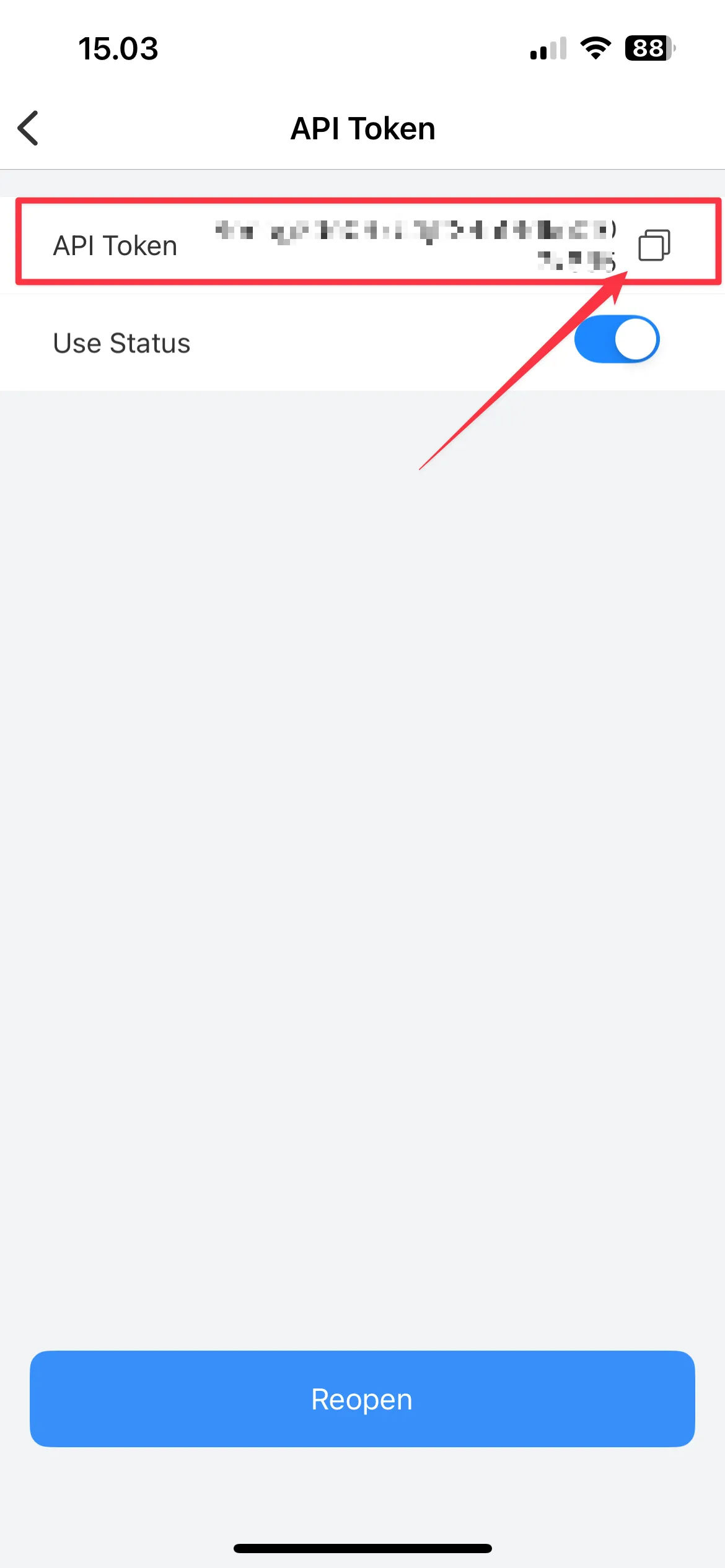 Kopier API-nøglen ved at klikke på det lille “firkant” symbolen til højre for nøglen. Bemærk at “Use Status” skal være aktiveret”