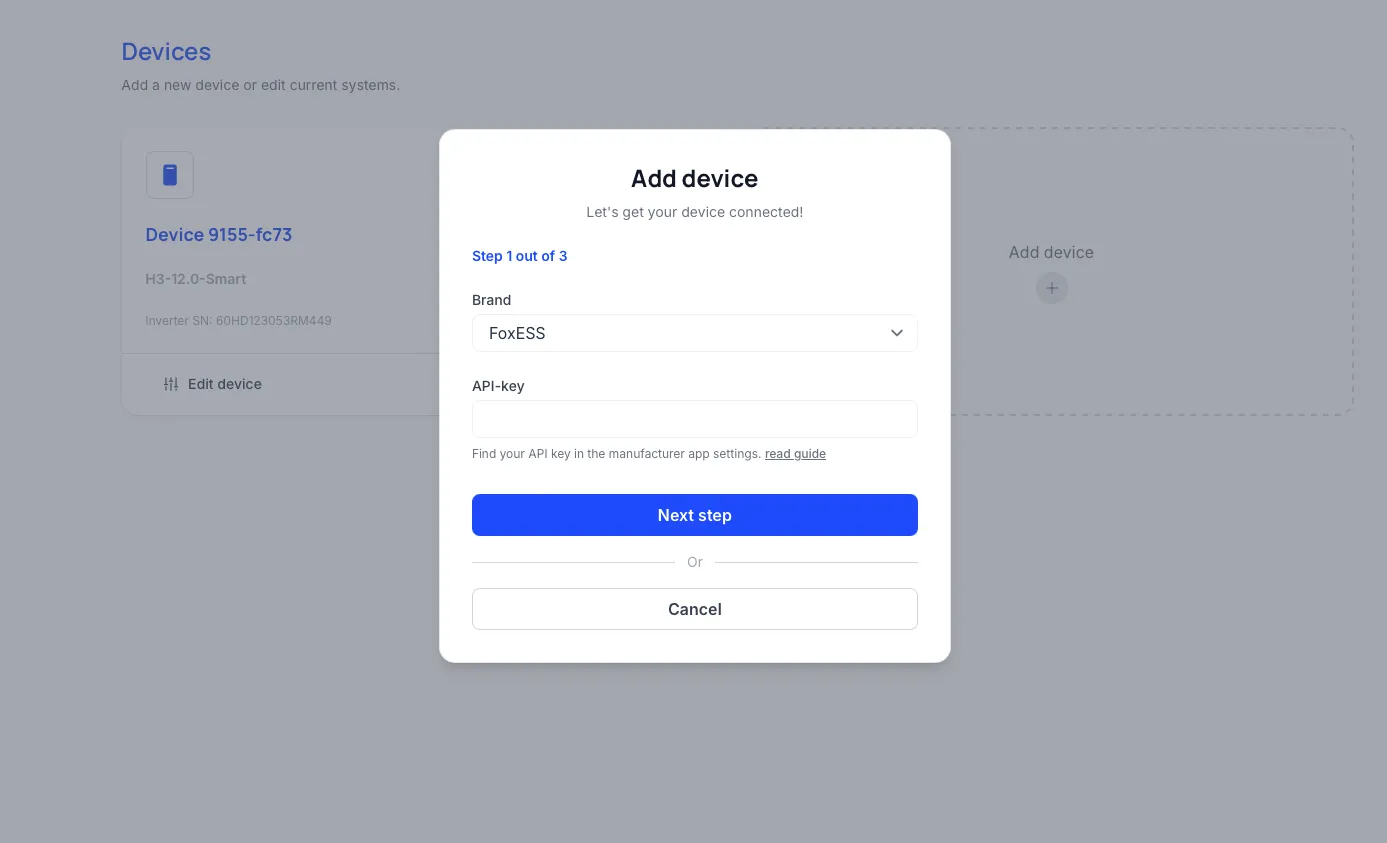 Her skal du oprette dit device så NordCharger kan kommunikere med dit solcelleanlæg. Oprettelsen foregår i tre trin.