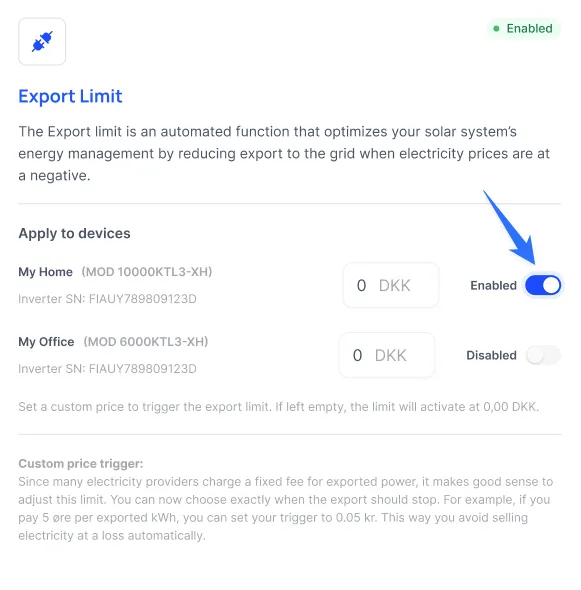 På samme side kan du også aktivere Export Limit. Funktionen sørger for at dine solceller kun eksporterer strøm til elnettet når du får betaling for det.