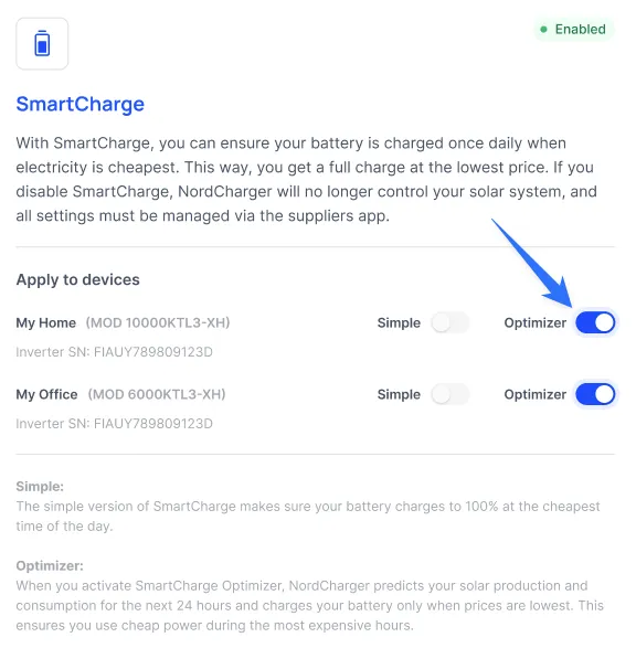 Her kan du aktivere SmartCharge for dit anlæg. Du kan vælge mellem to tilstande.