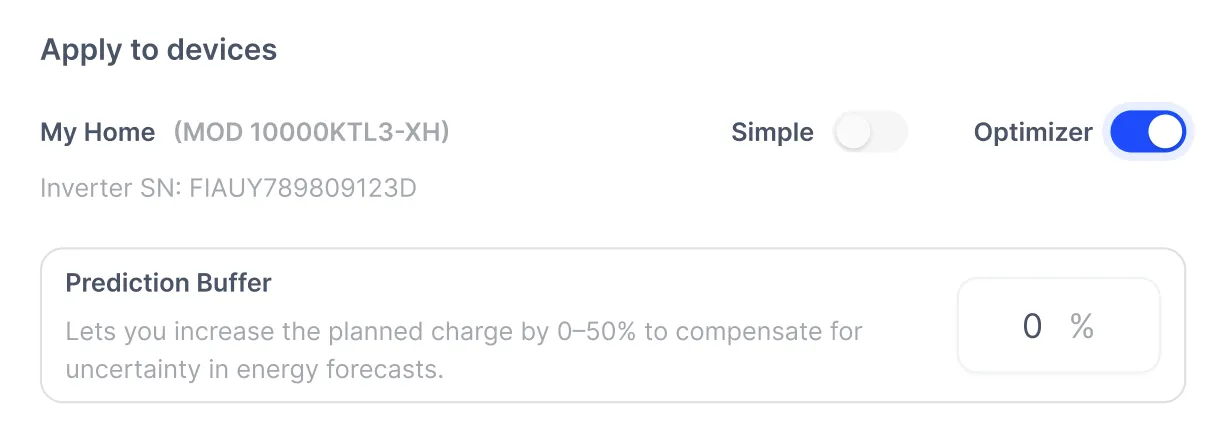 Når du aktiverer SmartCharge med Optimizer, kan du indstille en Prediction Buffer. Den bør som udgangspunkt stå på 0%, men kan hæves, hvis du forventer et højere forbrug.